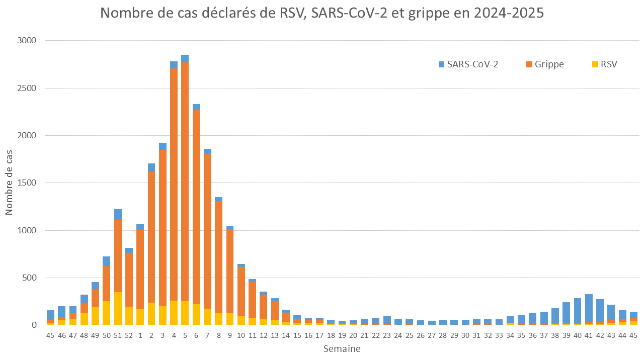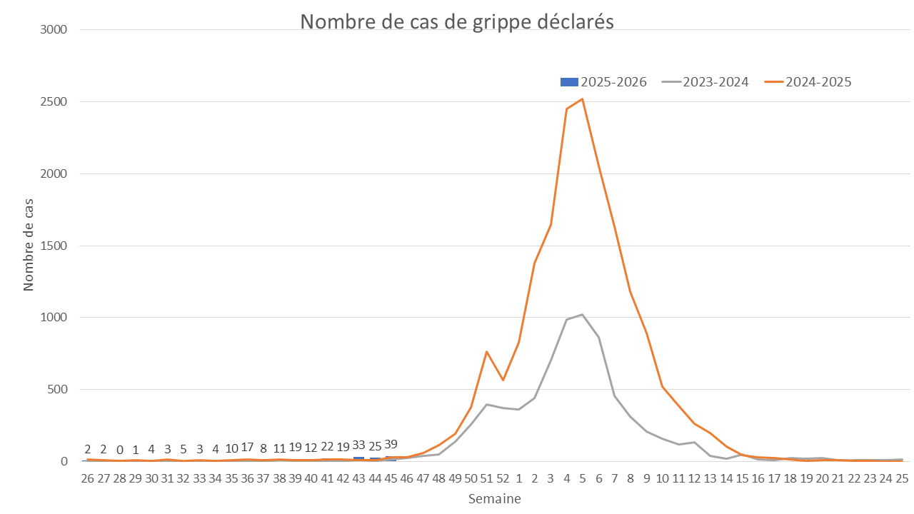 Au cours de la semaine 45, du 3 au 9 novembre 2025, le nombre de cas de grippe déclarés par les laboratoires a augmenté légèrement, passant de 25 à 39 cas.
