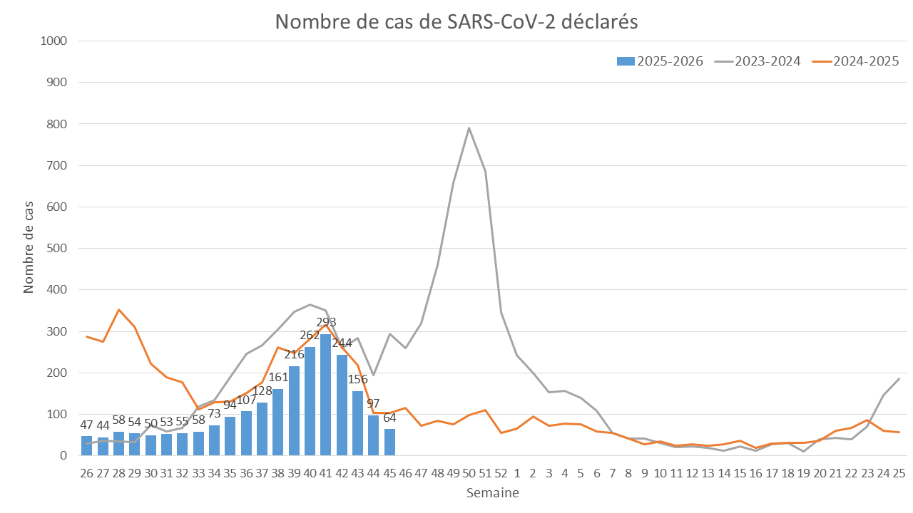 Au cours de la semaine 45, du 3 au 9 novembre 2025, le nombre de cas positifs au SARS-CoV-2 diminue, passant de 97 à 64 cas, soit une baisse de 29 % par rapport à la semaine précédente.