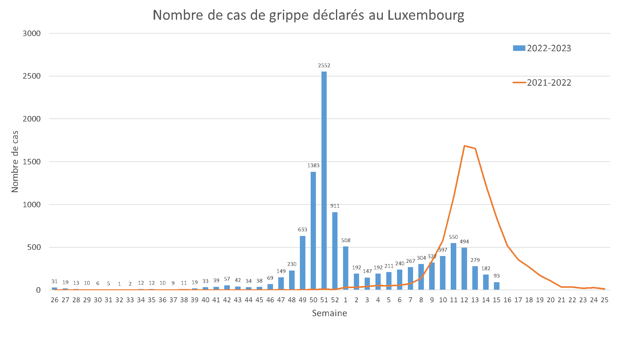 Pour la semaine du 10 au 16 avril 2023, le nombre de cas de grippe (influenza) déclarés par les laboratoires a évolué de 182 à 93 cas, soit une diminution de 48,9% par rapport à la semaine précédente. Actuellement le virus influenza de type B est prépondérant.