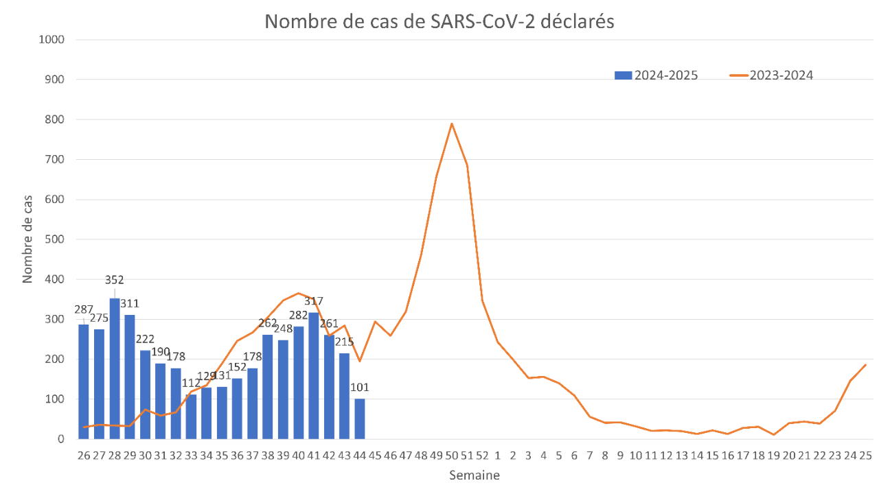 Au cours de la semaine 44, du 28 octobre au 3 novembre 2024, le nombre de cas positifs au SARS-CoV-2 diminue, passant de 215 à 101 cas, soit une baisse de 53% par rapport à la semaine précédente.