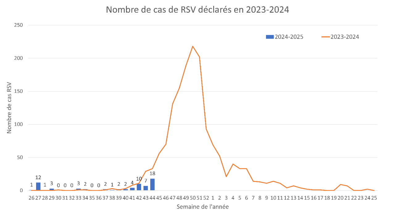 Pour le RSV, une augmentation a été observée, avec 18 cas confirmés, contre 7 la semaine précédente.
