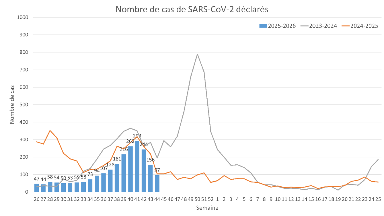 Au cours de la semaine 44, du 27 octobre au 2 novembre 2025, le nombre de cas positifs au SARS-CoV-2 diminue, passant de 156 à 97 cas, soit une baisse de 38 % par rapport à la semaine précédente.