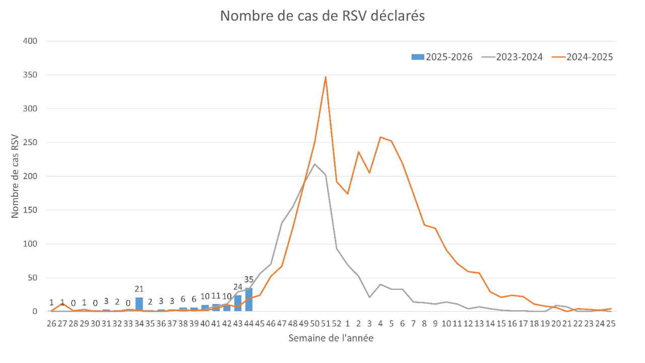 Pour le RSV, une légère augmentation a été observée, avec 35 cas confirmés, contre 24 la semaine précédente, tout en demeurant à un niveau bas.