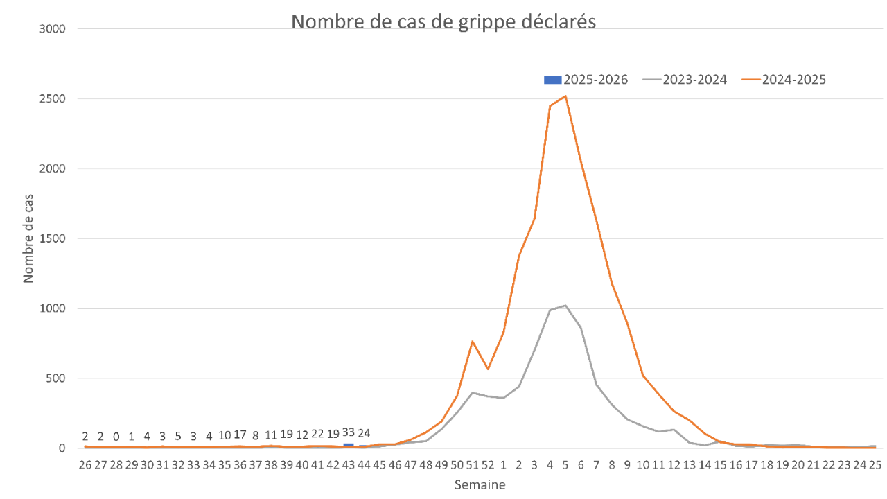 Au cours de la semaine 44, du 27 octobre au 2 novembre 2025, le nombre de cas de grippe déclarés par les laboratoires a diminué légèrement, passant de 33 à 24 cas. Pendant la dernière semaine, il y a eu 100 % de grippe A parmi les résultats typés.