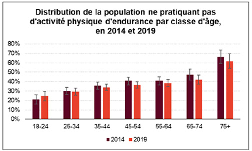 Figure 1 Distribution de la population ne pratiquant pas d’activité physique d’endurance par classe d’âge, en 2014 et 2019 (8)